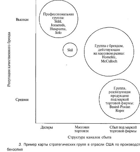Выделение стратегических групп представляет аналитический метод, предназначенный для проведения структурного анализа. В то же время оно служит промежуточным этапом между рассмотрением отрасли в целом и каждой фирмы по отдельности. В конечном счете каждая фирма уникальна, поэтому классификация фирм по стратегическим группам неизбежно ставит вопрос о том, какая степень различий в стратегии является существенной. Ответ на него должен вытекать из структурного анализа: чтобы определить их принадлежность к стратегической группе, необходимо выявить различие между фирмами в стратегии, если оно в значительной мере влияет на структурную позицию фирм. В дальнейшем я вернусь к этому вопросу, говоря о практическом использовании метода графического отображения стратегических групп в качестве аналитического инструмента.