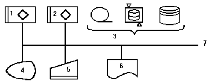 1-микропроцессор, 2-основная память, 3-ВЗУ, 4-дисплей, 5-клавиатура, 6-печатающее устройство, 7-системная магистраль.