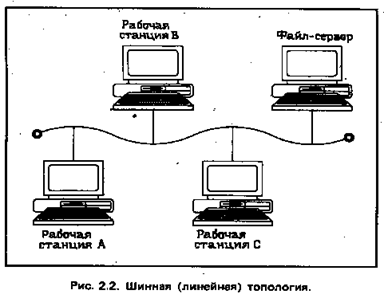 Топология "общая шина" предполагает использование одного кабеля, к которому подключаются все компьютеры сети (рис. 2.2). В случае "общая шина" кабель используется совместно всеми станциями по очереди. Принимаются специальные меры для того, чтобы при работе с общим кабелем компьютеры не мешали друг другу передавать и принимать данные.