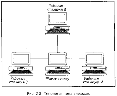 На рис. 2.3 показаны компьютеры, соединенные звездой. В этом случае каждый компьютер через специальный сетевой адаптер подключается отдельным кабелем к объединяющему устройству.