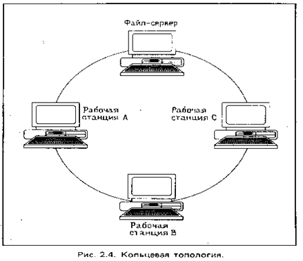 Используется также топология "кольцо" (рис. 2.4). В этом случае данные передаются от одного компьютера к другому как бы по эстафете. Если компьютер получит данные, предназначенные для другого компьютера, он передает их дальше по кольцу. Если данные предназначены для получившего их компьютера, они дальше не передаются.