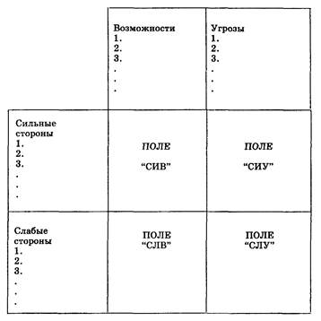 После того как конкретный список слабых и сильных сторон организации, а также угроз и возможностей составлен, наступает этап установления связей между ними. В левой части матрицы выделяются два раздела (сильные стороны, слабые стороны), в которые соответственно вписываются все выявленные на первом этапе анализа сильные и слабые стороны организации. В верхней части матрицы также выделяются два раздела (возможности и угрозы), в которые вписываются все выявленные возможности и угрозы. На пересечении разделов образуются четыре поля: