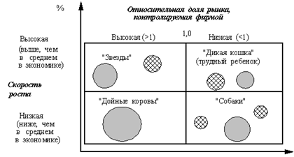 Как видно из данных табл. 2., в отношении каждой СБЕ необходима своя стратегия, которая прежде всего определяется тем, емкостью рынка стадией жизненного цикла товара, долей рынка и уровнем рентабельности.