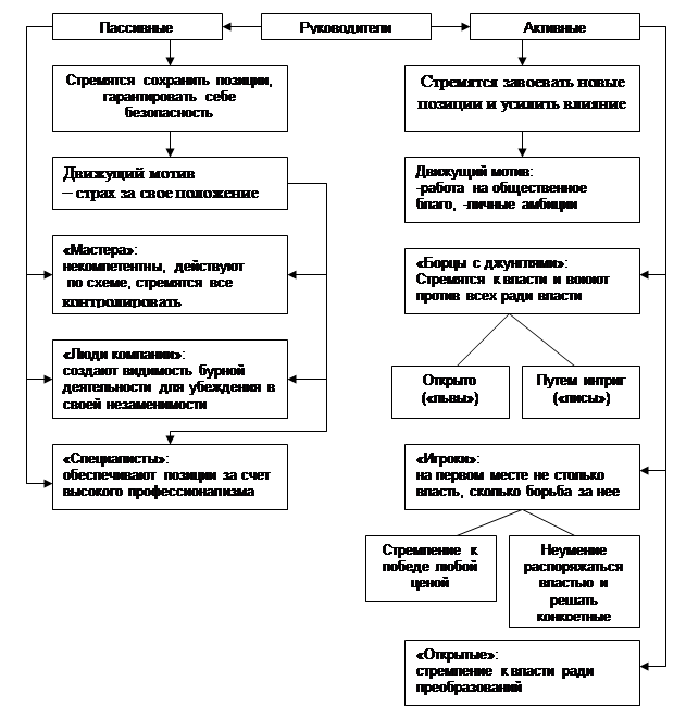 По своей ориентированности на определенный характер действий руководители делятся на активных и пассивных. Основная цель пассивных состоит в сохранении любой ценой своих позиций в организации традиций, дополнительно гарантирующих стабильность. В противоположность им активные руководители стремятся к расширению сферы своего влияния как для получения еще большей власти, так и ради организации и достижения общего блага. По способам действия пассивных руководителей можно условно разделить на две группы. Одни, получившие в западной управленческой литературе название мастеров, пытаются сохранять свое положение путем тотального контроля за подчиненными, действий по схеме, требования от исполнителей безраздельного подчинения, пресечения критики в свой адрес, препятствия коммуникациям, отказа от нововведений и любого риска, словом, всего того, что может это положение поколебать и вскрыть их некомпетентности.