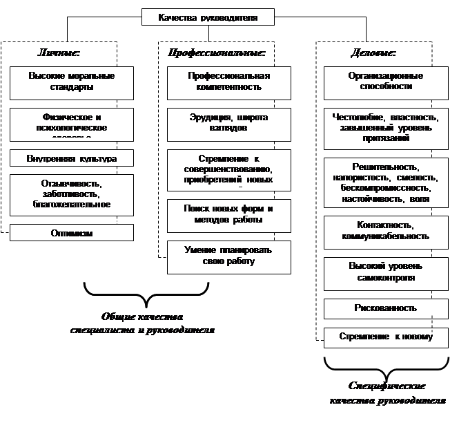 К профессиональным качествам относят те, которые характеризуют любого грамотного специалиста и обладание которыми служит лишь необходимой предпосылкой выполнения им обязанностей руководителя. Личные качества руководителя также мало чем должны отличаться от качеств других работников, желающих, чтобы их уважали и с ними считались, поэтому обладание ими тоже всего лишь предпосылка успешного руководства. Однако руководителем делают человека не профессиональные или личные, а деловые качества.
