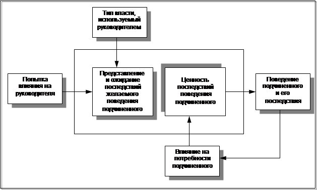 Все формы влияния побуждают людей исполнять желания другого человека удовлетворяя неудовлетворенные потребности или препятствуя их удовлетворению, или они побуждают исполнителя ожидать, что потребность будет или не будет удовлетворена в зависимости от поведения исполнителя. Люди строят предположения относительно того, что может произойти, если они будут вести себя определенным образом. Видя именно такое поведение, человек начинает представлять в уме воздействия его или ее поведения на состояние его или ее потребностей. А руководитель также представляет эффект своего влияния на поведение будущего исполнителя. В результате руководитель и исполнитель усваивают схожую или несхожую манеру поведения на будущее. Этот процесс влияния руководителя на подчиненного представлен на рисунке: