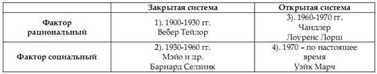 Развитие теории управления и, прежде всего, управления людьми в процессе производственной деятельности описывается авторами с различных позиций. Например, Р. Скотт, рассматривая теорию управления в развитии с двух точек зрения: закрытой и открытой систем и рационального и социального факторов, выделил четыре этапа в развитии теории и практики управления (см. таблицу 1).