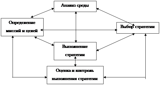 Стратегическое управление можно рассматривать как динамическую совокупность пяти взаимосвязанных управленческих процессов: анализ среды; определение стратегических альтернатив; выбор стратегии; выполнение стратегии; оценка и контроль выполнения стратегии.