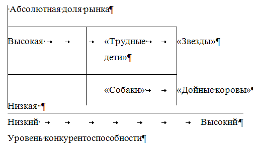 Для выбора стратегии по методу Бостонской консалтинговой группы (БКГ) применяется разработанная ею матрица БКГ. Важнейшими классификационными признаками рыночной позиции фирмы, по определению Бостонской консалтинговой группы, являются темпы роста рыночного спроса и отношение доли на рынке товара данной фирмы к соответствующей доле основного конкурента.