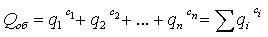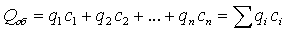 Qоб применяется, когда надо выразить сложное свойство качества продукции. Например, надежность изделия является обобщенным показателем нескольких более простых показателей (безотказность, долговечность, ремонтопригодность и др). Допустим, что надо определить обобщенный показатель надежности. Рассчитаем дифференциальным методом несколько простых показателей надежности q1 , q2 , q3 … qn . Зададимся коэффициентами весомости сi каждого из простых показателей в комплексном показателе, соблюдая при этом условие, что сумма весов всех простых показателей равна 1. В итоге обобщенный показатель будет выражаться следующей зависимостью:
