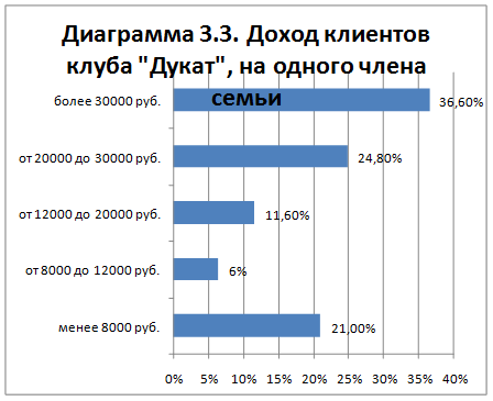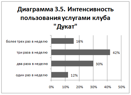 Имея возможности обслуживать в месяц до 800 человек, фитнес клуб «Дукат» в данное время принимает в своих стенах всего 400. В общем сравнении результат неплохой, опять стабильная средняя позиции. После проведения всех исследований микросреды фитнес клуба «Дукат», мы составим план развития, который будут способствовать увеличению спроса на услуги клуба.