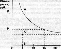 Приведенная графически зависимость показывает, что расширение объектов вложения капитала, т. е. рассеивания риска, от 5 до 15 позволяет легко и значительно уменьшить объем риска с величины ОР1 до величины ОР2 .