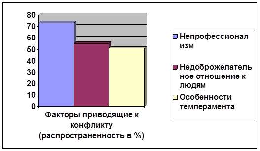 Анализируя результаты двух этапов исследования, следует отметить, что: анкетный опрос, проводившийся среди всех работников коллектива ТД, показал: а) непрофессионализм выступает превалирующим фактором, приводящим к конфликту (в 73% случаев из 100%) в рабочем коллективе ТД; б) наиболее значимыми характерологическими особенностями подчиненного, влияющими на возникновение конфликта выступили: недобросовестное отношение к работе (6.2 балла); в) самой значимой характерологической особенностью подчиненного, влияющей на возникновение конфликта, выступает недобросовестное отношение к работе (6.2 балла из 8); коллеги - завышенная самооценка (5.1 балла); руководителя – также завышенная самооценка (6.7 балла); среднеарифметическая оценка работниками ТД степени влияния должностного статуса (руководитель-подчиненный) на возникновение конфликта превышает среднеарифметическую оценку степени влияния личного