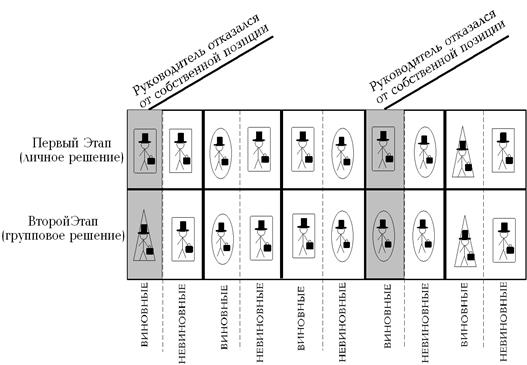 По данным экспериментальной части исследования, большая часть (67%) участников в ходе принятия решения склонилась к позициям, заданным и отстаиваемым представителями руководства. Данный факт подтверждает выдвинутую гипотезу, заключавшуюся в предположении, что в рабочем коллективе, где доминируют деловые отношения над социально-эмоциональными, руководящие позиции определяют принятие общегруппового решения в противоречивых ситуациях.