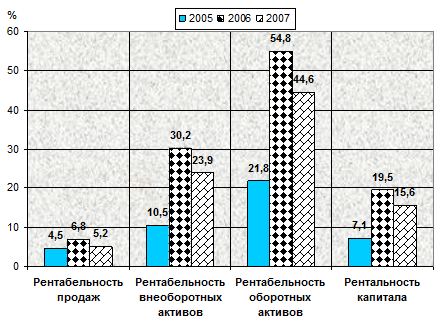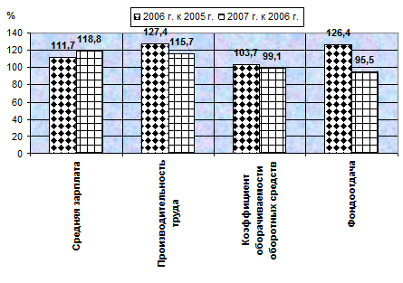 Прослеживается тенденция основных показателей эффективности использования основных средств за 2005 - 2007 гг. к росту. В 2007 году по сравнению с 2005 годом произошло увеличение стоимости основных средств на 26,2%, фондоотдачи - на 20,7%, рентабельности основных средств - более чем в 2,4 раза.