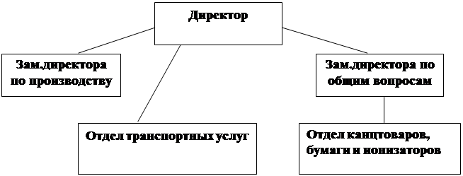 Как видно из схемы, оба заместителя как по производству, так и по общим вопросам подчиняются директору. Кроме того, директор возглавляет отдел по грузоперевозкам. Заместителю по общим вопросам поручено контролировать деятельность отдела канцтоваров, бумаги и ионизаторов, в этом ему, зачастую, помогает заместитель директора по производству, в частности он занимается наиболее крупными клиентами. Бухгалтерия является внештатной и в структуру предприятия не входит.