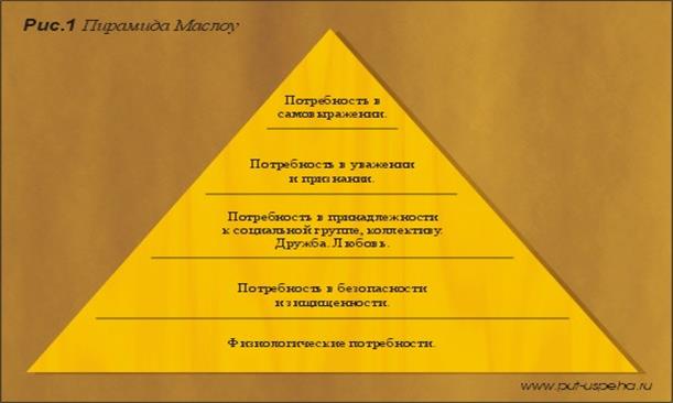 Базой для многих современных теорий мотивации являются исследования американского психологаАбрахама Маслоу (1908-1970).А. Маслоу предположил, что человек мотивируется удовлетворением серии потребностей, выстроенных в иерархическую пирамиду - пирамиду ценностей А. Маслоу (см. приложение 1). Теория А. Маслоу внесла исключительно важный вклад в понимание того, что лежит в основе стремления людей к работе. Руководители различных организаций стали понимать, что мотивация людей определяется широким спектром их потребностей. Для того чтобы мотивировать конкретного человека, руководитель должен дать удовлетворить ему важнейшие потребности посредством такого образа действий, который способствует достижению целей всей организации. Еще не так давно руководители могли мотивировать подчиненных почти только экономически, поскольку поведение людей определялось, в основном, их потребностями низших уровней. Сегодня ситуация изменилась. Благодаря высоким заработкам и социальным благам, даже люди, находящиеся на низших ступенях иерархической лестницы организации, стоят на относительно высоких ступенях иерархии Маслоу [17, с.368].