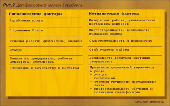 Теория мотивации Фредерика Герцберга появилась в связи с растущей необходимостью выяснить влияние материальных и нематериальных факторов на мотивацию человека. Фредерик Герцберг создал двухфакторную модель, которая показывает удовлетворенность работой (см. приложение 2). В своей модели Ф. Герцберг определял ответственность, достижение цели и потребность профессионального роста как "факторы удовлетворения от работы или факторы мотивации". Неадекватную заработную плату, недостаточную безопасность труда, плохие условия труда, напряженные отношения с работодателем и др. он определял как "факторы неудовлетворенности". Таким образом, согласно его теории, наличие гигиенических факторов не будет мотивировать работников. Они только предотвратят возникновение чувства неудовлетворенности работой. Реально жесам труд является фактором мотивации.