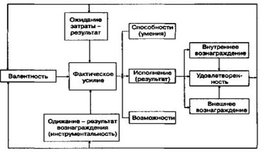 Процессуальные теории рассматривают мотивацию в ином плане. В них анализируется, как человек распределяет свои усилия для достижения целей и как он выбирает свою линию поведения. Ожидания, согласно теории ожиданий Виктора Врума (см. приложение 3), можно расценивать как оценку вероятности события. При анализе мотивации рассматривается взаимосвязь трёх элементов: затраты - результаты; результаты - вознаграждение; валентность. Теория справедливости постулирует, что люди субъективно оценивают полученное вознаграждение, соотнося его с затраченными усилиями и вознаграждением других людей. Теория мотивации Л. Портера - Э. Лоулера построена на сочетании элементов теории ожиданий и теории справедливости. Суть ее в том, что введены соотношения между вознаграждением и достигнутыми результатами (см. приложение 4).