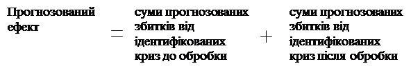 Витрати на управління антикризовими програмами виражається як сума втрат і витрат на обробку ідентифікованих криз плюс сума втрат і витрат на обробку не ідентифікованих криз. Значення ефекту управління кризами визначається різницею прогнозованого ефекту і фактичних витрат на керування кризами. Слід зазначити, що на початкових етапах використання даної методики ефект від неї може показатися не досить значним, проте за час використання найбільш діючих методів профілактики і боротьби з наслідками числове значення показника ефекту управління кризами буде, безсумнівно, зростати [22,23].