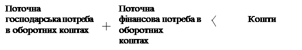 З позицій фінансового менеджменту кризовий стан підприємства полягає в його нездатності здійснювати фінансове забезпечення поточної виробничої діяльності, зменшенні його ринкової вартості або падінні курсу його акцій, а також максимізації ризику неплатоспроможності [48]. Недостатність коштів для фінансового забезпечення поточної діяльності можна відобразити у вигляді нерівності [27,28]: