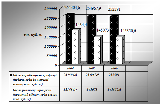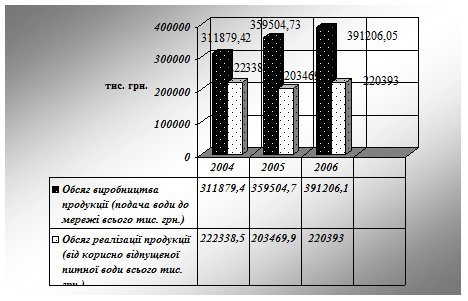 Розглянувши виконання виробничої програми КП “Втп “ВОДА”, можна сказати, що у 2004 році був найбільший обсяг подачі води до мережі і складав 254304,6 тис. куб. м. Річний обсяг виробництва питної води (подача води до мережі, всього) у 2005 році порівняно з 2004 зменшився на 9336,7 тис. грн., або на 3,54%, така динаміка простежується й у 2006 році, знову помітне зменшення обсягів виробництва на 2576,9 тис. грн., або 4,51%. Також, можна зазначити, що відбуваються суттєве зменшення обсягу реалізації води, яка була відпущена населенню та комунально-побутовим організаціям, в наслідок збільшення неврахованих втрат води та “незбалансованого обсягу”. Так у 2004 році корисний відпуск води становив 181434,4 тис. куб. м., за аналогічний період 2005 року відбувається зменшення на 26361,4 тис. куб. м. або на 14,86%. У 2006 році тенденції до зменшення корисного відпуску води споживачам продовжуються, можна відмітити зниження на 9722,4 тис. куб. м. На цей результат вплинуло збільшення втрат неврахованих з обліком “незбалансованого обсягу” на 24727,7 тис. куб. м або (підвищення на 29,8% порівняно з показником 2004 року за аналогічний період).