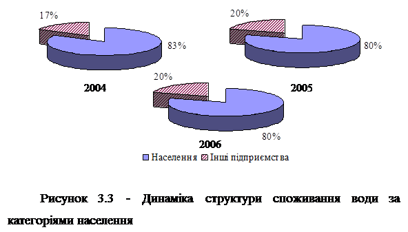 Стосовно структури споживання води за категоріями можна сказати, що найбільша питома вага належить населенню, у 2004 році вони його частка у загальній структурі складає складають 83,4%, у 2005 – 79,6%, а у 2006 – 79,22.