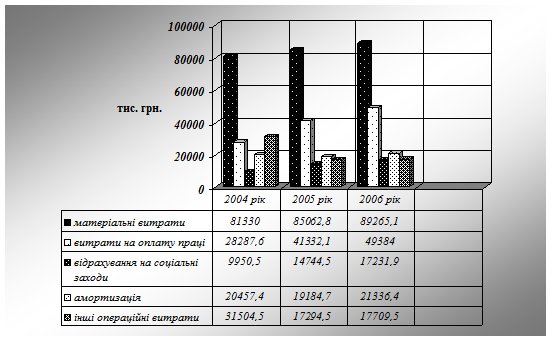 Аналізуючи експлуатаційні витрати, можемо казати, що найбільша питома вага в структурі витрат виробничої собівартості належить матеріальним витратам, так, в 2004 р. їх питома вага складала 47,41%, або 81330,0 тис. грн., в 2005 р. – 47,89%, або 85062 тис. грн., а в 2006 р. – 45,79%, або 89265,10 тис. грн. Спостерігається збільшення питомої ваги витрат на оплату праці з 28287,6 тис. грн. або 16,49%, у 2004 році до збільшення на 41332,1 тис. грн. або на 46,11% у 2005 році. на 1,4 тис. грн., порівняно з 2004р., у 2006 року продовжується тенденція збільшення і становить 0,5 тис. грн. Має місце збільшення питомої ваги витрат на оплату праці основних виробничих робітників на 2239,8 тис. грн. Ріст питомої ваги витрат на оплату праці викликано встановленням нової мінімальної заробітної плати у розмірі 400 грн.