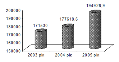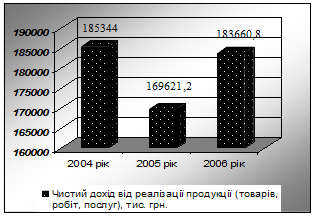 Характеризуючи експлуатаційні доходи підприємства, можемо констатувати, що вони мають тенденції до зменшення так у 2004 році підприємство отримало чистий дохід в розмірі 185344 тис. грн., 2005 році підприємство отримало на 15722,80 тис. грн. або 8,48% менше ніж за аналогічний період 2004 року. У 2006 році, порівняно з 2005 р., спостерігається збільшення доходу на 14039,60 тис. грн. або на 8,28% але у 2006 р. він менше доходу яке отримало підприємство у 2004 році на 1683,20 тис. грн. або на 0,91%. Таким чином, середній темп росту за три роки є від’ємним і складає 99,54%, а середній темп приросту за цей же період дорівнює – 0,46%.