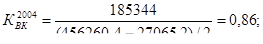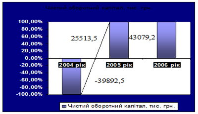 З таблиці 3.25 видно, що фінансовий стан, значно погіршився зокрема у 2004 році спостерігається значне зменшення власних оборотних коштів та маневреності власного капіталу за рахунок зменшення оборотних активів, зокрема чистої реалізаційної вартості дебіторської заборгованості за товари, роботи, послуги, яка на кінець 2004 року становила 139713 тис. грн. та підвищенням кредиторської заборгованості, яка відповідно складає 191253,6 тис. грн. Також негативні наслідки на фінансовий стан внесли зміни у структурі власного капіталу підприємства протягом 2004 року, основним фактором зменшення власного капіталу послугував непокритий збиток підприємства який на кінець 2004 року становив 38331,2 тис. грн. так у 2005 році робочий і функціональний капітал становив 25521,7 тис. грн., відповідно у 2006 році відбувається його збільшення на 15884,5 тис. грн., за рахунок структурних змін у власному капіталі, зокрема збільшенню частки іншого додаткового капіталу, та зменшенні непокритого збитку підприємства у забезпеченні підприємства власними оборотними