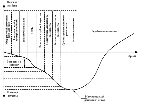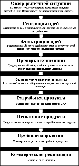 При этом инновационный процесс включает в себя ряд последовательных этапов: систематизация поступающих идей нововведений, формирование идеи нового продукта, анализ экономической эффективности нового продукта, создание нового продукта, тестирование нового товара на рынке, принятие решения о внедрении нового продукта в производство[6] .