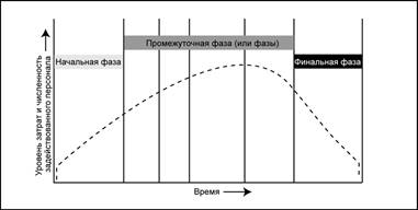 Рисунок 1. Типичный пример изменения уровня затрат и численности задействованного персонала в течение жизненного цикла проекта