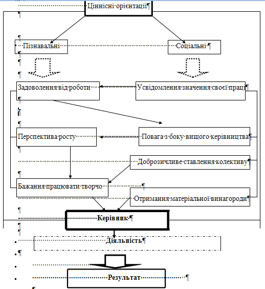 Соціальні цінності і мотиви, заломлюючись крізь призму індивідуальної життєдіяльності, входять до психологічної структури керівника у формі особистісних його цінностей. Кожному керівнику освіти притаманна специфічна ієрархія цінностей, які виступають зв’язуючою ланкою між культурою суспільства і сформованою керівником культурою навчального закладу, між суспільним та індивідуальним [110, 164].