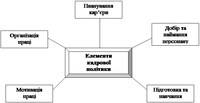 Основними елементами кадрової політики (рис. 1.1) є відбір та наймання персоналу, підготовка працівників до роботи та їх .подальше періодичне навчання, мотивація і організація праці, планування службового зросту.