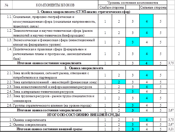 Анализ внутренней и внешней среды НЗБИ был проведен посредством заполнения специально разработанных анкет, содержащих перечень оцениваемых компонентов. В основе анкеты по состоянию внешней среды были использованы элементы СТЭП-анализа. Проведенный анализ выявил сильные и слабые стороны потенциала организации, а также внешние угрозы и возможности.