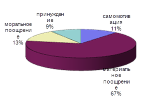 Таким образом, по признаку мотивации на предприятии преобладают работники, которым наиболее важно материальное поощрение (67%), в моральном поощрении нуждаются 13%. Под принуждением работают 9% работников предприятия ООО «Муромец».