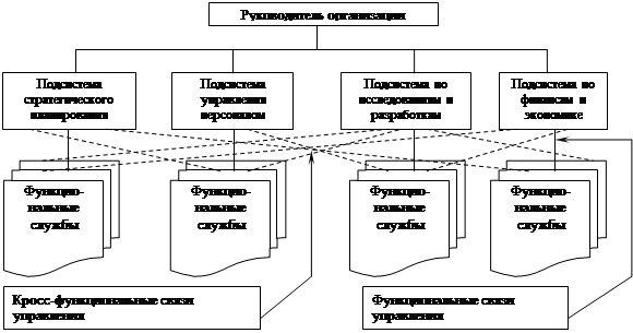 Основу линейно-функциональной структуры составляет «шахтный» принцип построения и специализация управленческого персонала по функ-циональным подсистемам организации (маркетинг, производство, исследо-вания и разработки, финансы, персонал и т. д.). По каждой подсистеме фор-мируется иерархия служб («шахта»), пронизывающая всю организацию сверху донизу (рис. 1).