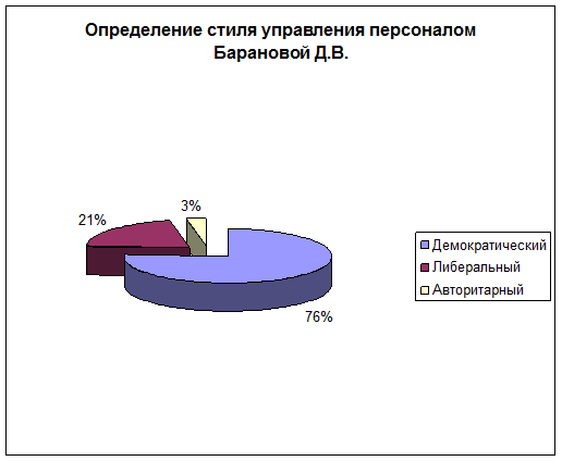 Как руководитель, Баранова Д.В. умеет координировать и направлять деятельность коллектива, развивает инициативу и новые методы работы. Она оказывает моральную поддержку сотрудникам, справедлива и тактична в профессиональных спорах, предупреждает конфликты и создает доброжелательную атмосферу в коллективе.