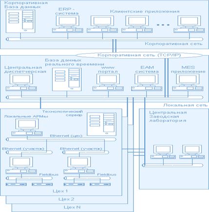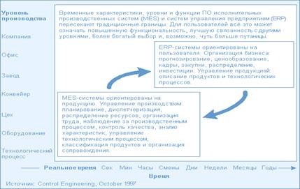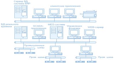 Объединение офисных функций с внутрицеховыми операциями далеко не тривиальная задача, учитывая разнородность используемых систем на нижнем уровне. Офисные функции более ориентированы на обработку документов и исполняются с такими временными интервалами, как часы, дни, недели и даже месяцы, в то время как технологическое управление производством характеризуется большим числом параметров, получаемых от уникальных процессов, оборудования и систем, время реакции которых измеряется миллисекундами. Различие в типах данных и скорости их передачи у различных систем предприятия требует постоянного накопления, обработки и анализа этой информации. Приводит к необходимости создания между офисными приложениями и системами управления технологическими процессами промежуточных накопителей и преобразователей информации.