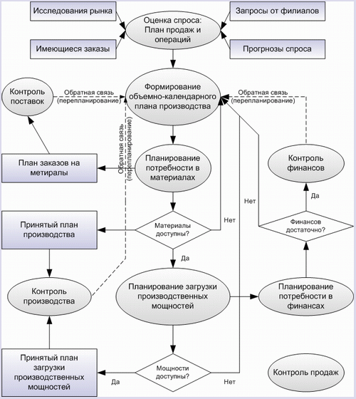 6. Обеспечение обратной связи, которое позволяет решать возникающие проблемы с поставщиками комплектующих материалов и реальными возможностями производства. Тем самым, это собственно и реализует «принцип замкнутой петли» в системе. Обратная связь особенно необходима при изменении отдельных планов, оказавшихся невыполнимыми и подлежащих пересмотрению.