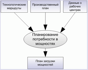 Для того чтобы производственная программа была осуществима, необходимо, чтобы имеющиеся в наличие производственные мощности смогли обработать то количество сырья и материалов-комплектующих, которое предписывает составленный функцией планирования потребности в материалах план заказов, и изготовить из них готовые изделия. Собственно план является основным входным элементом планирования потребностей в производственных мощностях. Другим немаловажным входным элементом является технологическая схема обработки / сборки конечного готового изделия. Обычно, производственные мощности предприятия классифицируются на производственные центры. Таким производственным центром может быть комбинация станков, инструментов, рабочих и т.д. Результатом работы функции является план потребности в производственных мощностях. Этот план определяет, какое количество стандартных часов должна работать каждый производственный центр, чтобы обработать необходимое количество материалов.