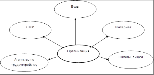 1) Непосредственную целенаправленную вербовку – налаживание организацией контактов, с теми, кто представляет для нее интерес в качестве потенциальных сотрудников с целью побудить интерес и подать заявление о работе. Она производится: