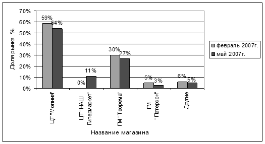 Практическое исследование, проведенное в рамках ООО ЦТ "Радуга", показало, что в рассматриваемой организации существует основная экономическая проблема – это потеря 5 % доли рынка за 4 месяца (среди гипермаркетов), что произошло из-за оттока клиентов к конкурентам компании.