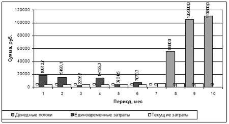 Из графика видно, что на начальном этапе нововведения на протяжении 7 месяцев были только затраты. И после того, как утвержденная система начала работать, денежные потоки увеличились и стали положительными.