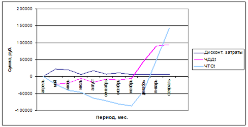 Из графика следует, что ЧДДtи ЧТСt возрастают с ноября, при том, что затраты до ноября снижаются и с данного месяца постоянны. Это свидетельствует о том, что проект считается экономически привлекательным.