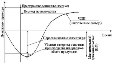 Максимальный денежный отток с учетом дисконтирования (потребность в финансировании с учетом дисконта, ДПФ) – максимальное значение абсолютной величины отрицательного накопленного дисконтированного сальдо от инвестиционной и операционной деятельности. Величина ДПФ показывает минимальный дисконтированный объем внешнего (по отношению к проекту) финансирования проекта, необходимый для обеспечения его финансовой реализуемости (рис. 6).