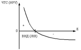 На рис. показано, что с ростом требований к эффективности инвестиций величина ЧТС уменьшается, достигая нулевого значения при пересечении с осью абсцисс. Норма дохода, определяющая такое значение ЧТС, является внутренней нормой дохода проекта.