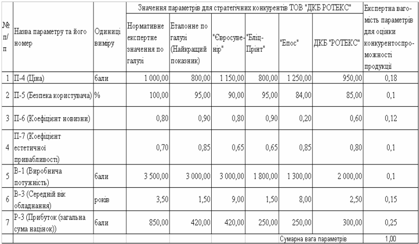 - проаналізовані з застосуванням експертних методів цінові та нецінові характеристики продукції ТОВ “ДКБ „РОТЕКС” у порівнянні з основними конкурентами;