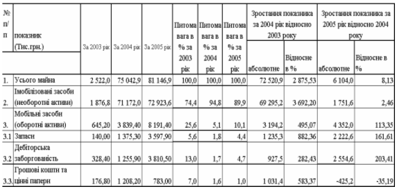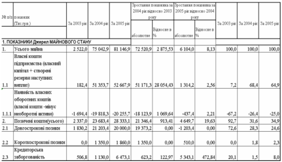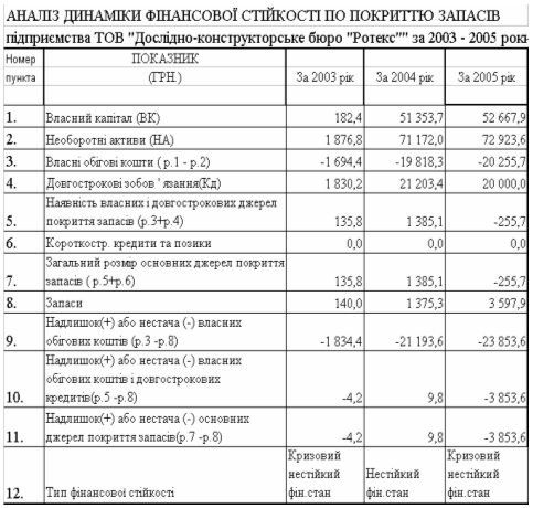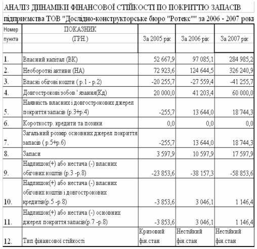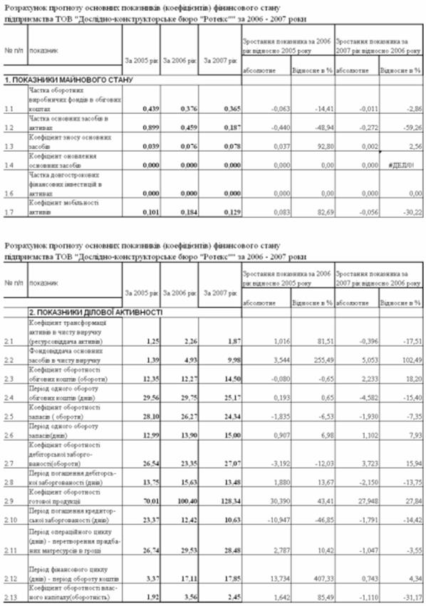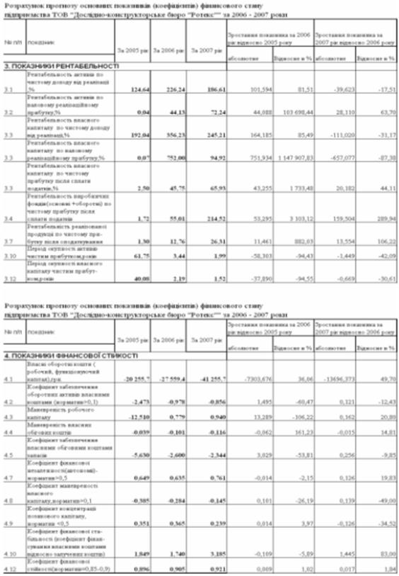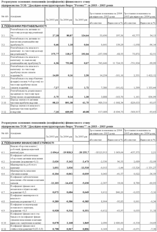 Аналіз результатів вторинної (коефіцієнтної) статистичної обробки балансових звітів та звітів про фінансові результати діяльності ТОВ «Дослідноконструкторське бюро «РОТЕКС» за 2003 –2005 роки показав: