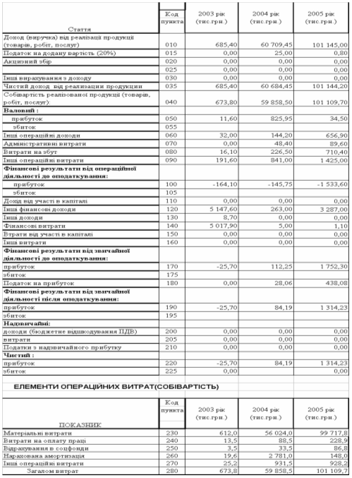 - темп росту чистих фінансових результатів діяльності (чистого прибутку) за 2003 2005 рік становить +5 213 %(з рівня збитків 25,7 тис.грн. до рівня прибутку +1314,2тис.грн.), що значно вище темпів росту валюти балансу (+3 217 %) та свідчить про інтенсивний характер розвитку ділової діяльності підприємства;